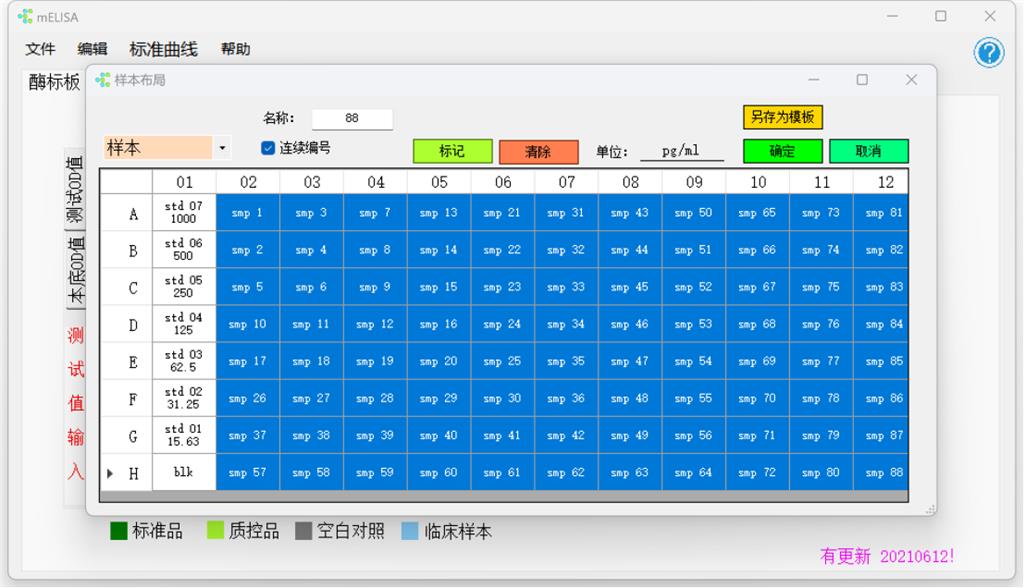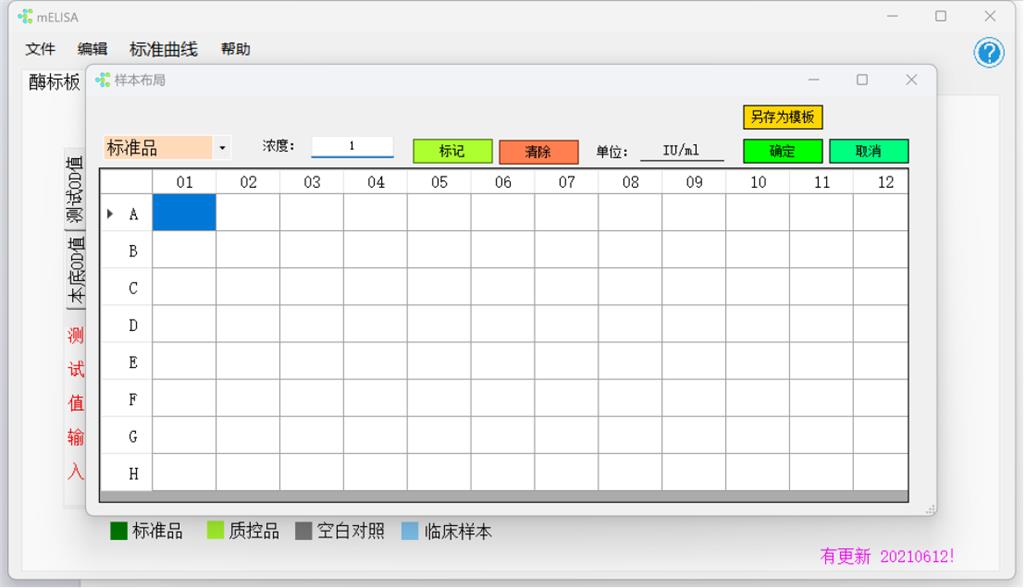 2.設置好標準品、空白對照、樣本孔,有質控品設置質控品孔(設置時可直接拉取設置孔位子,設置好點‘標記’,填寫好溶度和單位。)。 (如下圖以人il-6試劑盒為例。)