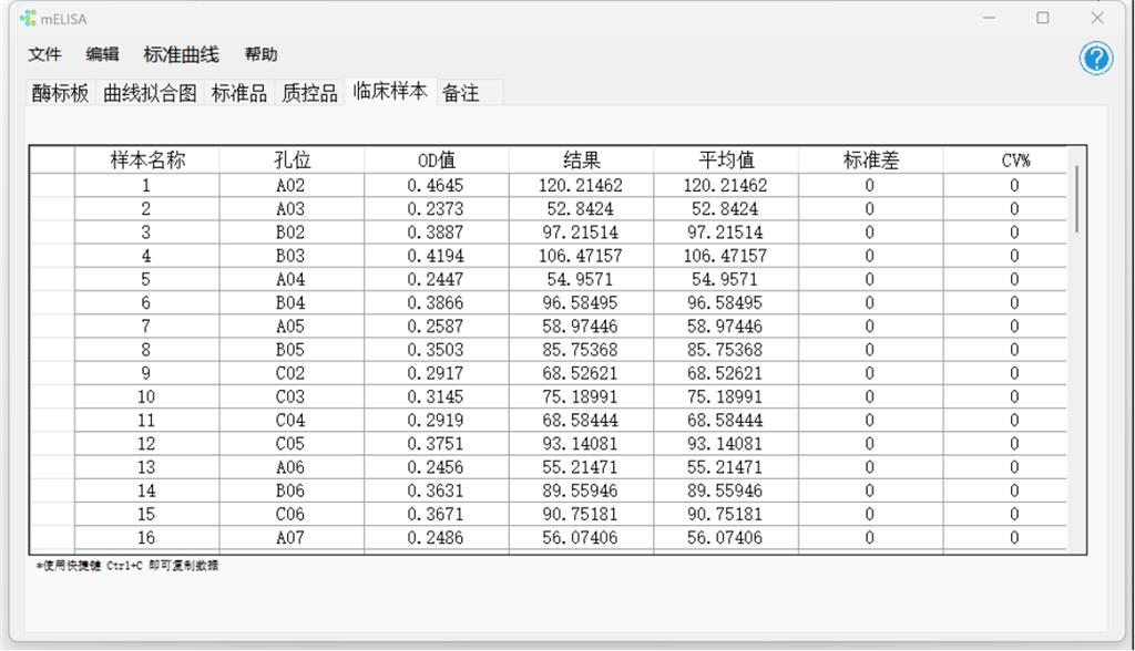 5.點擊‘臨床樣本’得到最終數據。可直接復制結果到EXCEL文檔里保存。